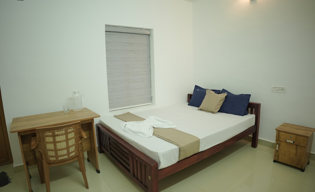A simple, restful room designed for deep sleep and quiet mornings. Modest in size, intentional in comfort, with shared living spaces.